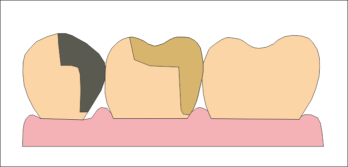 възстановяване - тъмното оцветяване. При него дори и да има добър контур и плавен преход към зъба, понякога венечната амбразура не е запълнена и остава