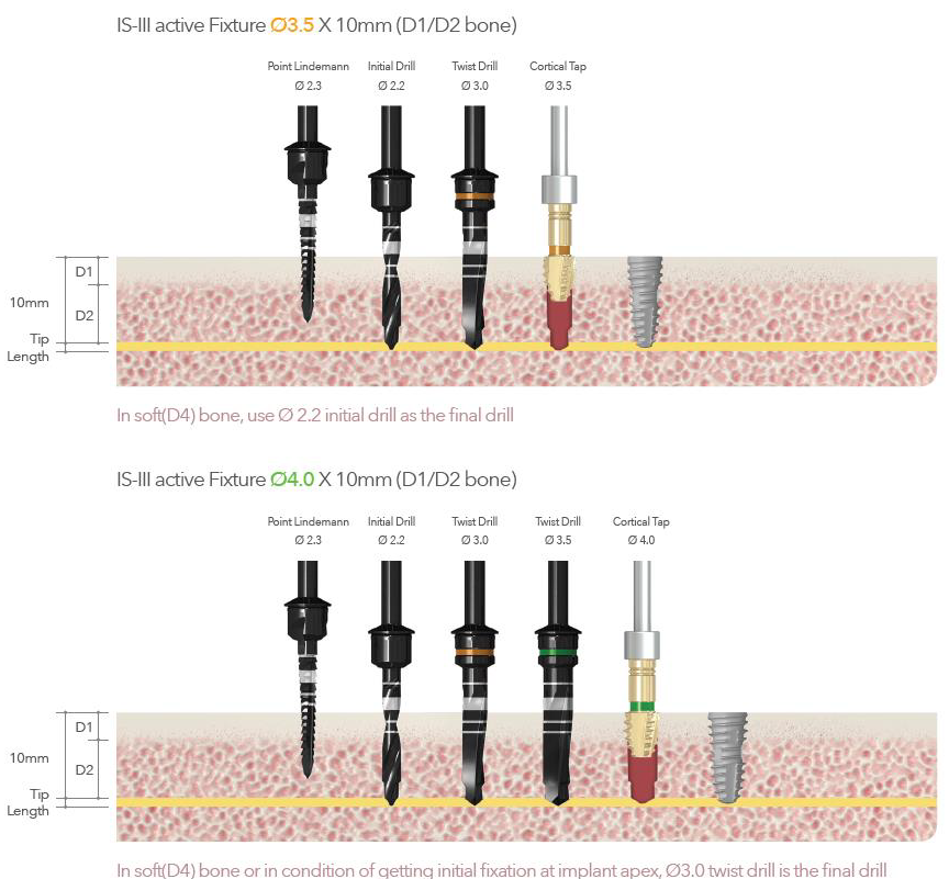 Освен всичко това в горните две схеми са налице две важни грешки, и то във всяка една от тях - с при костна плътност от порядъка на D1/D2 не се налага разпробиване с костния резбонарез до 1/2 от дълбочината на вече калибрования отвор, а много по-дълбоко - до 3/4 или дори до дъното на отвора. Тази подробност е изключително важна, защото колкото по-дълбоко се разпробива с метчика, толкова по-малък е постигнатият въртящ момент в края на поставянето на импланта и съответно вероятността от компресия с последваща некроза е по-малка. При плътност от порядъка на D4 пък резбонарезът просто не се използва - при поставянето самият имплант действа като метчик и дори се постига известно уплътняване на костта благодарение на компресията на костните отпилки.