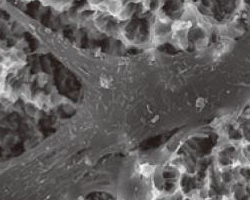 Скенираща електронна микроскопия на витален остеобласт, разположен върху имплантатната повърхност. Именно това представлява процесът на остеоинтеграция, който е от ключово значение за успеваемостта и трайността на лечението с импланти. Тъй като зъбни импланти се поставят масово в световен мащаб от началото на 60-те години на ХХ век, вече има натрупан огромен клиничен опит и дългогодишни наблюдения върху всички процеси в областта на костта и меките тъкани. Отдавна има доказателства че при правилно проведени лечебни процедури и добър оздравителен процес имплантът се интегрира трайно и плътно към костните тъкани - налице е остеоинтеграция. Това се наблюдава предимно при награпавените имплантатни повърхности и в много по-малка степен при полираните импланти - те се задържат в челюстните кости чисто механично, на принципа на макроретенцията. Въпреки че материалите, от които се изработват имплантите, всъщност са едни и същи (предимно чист титан), наличието на микрограпавини силно подобрява адаптацията на импланта към костните тъкани. Почистването на тези микрограпавини обаче е технически трудно - в случай че възникне проблем. Поради това при развитие на възпаление (периимплантит) прогресията е доста по-бърза и обширна в дълбочина и на ширина. При полираните зъбни импланти чрез хигиенни процедури е възможно да се осигури известно стациониране и дори спиране на процеса - което обаче изисква изключително постоянство и упоритост от страна на пациента.