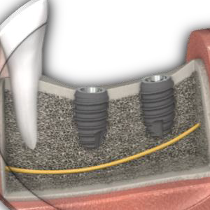 Лечение с импланти в страничния участък на долната челюст - триизмерна схема, която е предоставена на нашия екип от компанията Neobiotech. Статистически това се налага също много често - първите молари са едни от първите зъби, които се налага да се екстрахират по различни приини. От една страна, тези зъби поникват рано, когато не са достатъчно минерализирани и бързи се засягат от кариес. Много локализирани форми на пародонтит също се развиват първоначално при шестите зъби - което също води до загуба на зъба с последваща необходимост от протезиране. Всички тези увреждания засягат както долната, така и горната челюст - което изисква и съответното адекватно лечение на дефекта. При мандибулата е налице съдово - нервен сноп, който се разполага във вътрешността на костта и създава затруднения. Докато повдигането на пода на горночелюстния синус е технически лесно, транспозицията на долния алвеоларен нерв и артерия са доста по-трудни и изискват продължителен, неприятен и болезнен заздравителен процес. Интра- и постоперативните рискове при подобни интервенции са освен това доста по-големи.