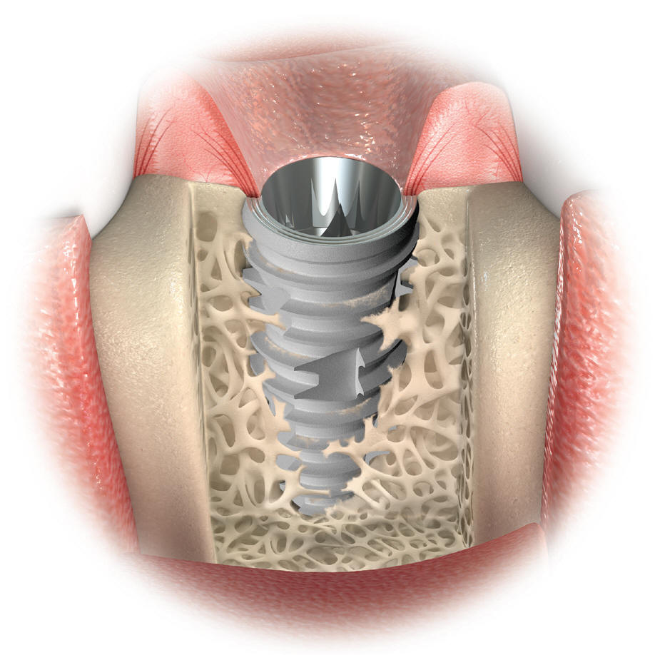 Схема на крайната цел на лечението с импланти - пълна остеоинтеграция на импланта, плътни и устойчиви меки тъкани. Около имплантатната шийка има увеличен костен обем - бежовите сферички показват наличието на изкуствена кост, а с тънка синя линия е означена бариерната мембрана. При правилно проведени оперативни интервенции това състояние е устойчиво не само в даден момент, а и напред във времето - пациентът понякога съхранява своите зъбни импланти за период от 60 и повече години. Всъщност това е крайната цел на хирурга - за протезиста и самия пациент наличието на един добре поставен, остеоинтегриран имплант означава единствено че в алвеоларния гребен е налице вътрекостен винт. Този винт вече може да се използва за задръжка на зъбна корона, мостова конструкция или снемаема протеза; докато обаче те не бъдат изработени естетично, биологично и функционално издържани, лечението просто не е приключило. В много случаи изработката на протезната конструкция е технически по-сложна, по-трудоемка и крие повече рискове от провали и усложнения отколкото поставянето на самия имплант. След като протезната конструкция е изработена и фиксирана, лечението с импланти не приключва - просто навлиза в своята поддържаща фаза. Необходими са периодични контролни прегледи и старателно почистване на зъбната плака и зъбния камък - всичко това е описано подробно по-долу, в края на настоящото изложение.