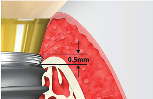 На горната схема добре се вижда полираната имплантатна шийка - тя се разполага на нивото на меките тъкани. Очевидно е че при един по-дебел гингивален биотип няма възможност за механични микротравми върху надкостната част на импланта - тя дори потъва на 0.5 - 1 милиметър под нивото на гингивата и е необходимо известно дооформяне на зъбния венец. Поради това много производители предлагат импланти с различна височина на полираната шийка - по-голяма за по-дебел венец и по-малка за по-тънък. Не се налага обаче разкриване на импланта - след приключването на оздравителния процес полираната имплантатна шийка се вижда и е заобиколена от здрава, плътна, бледорозова лигавица; с това предимствата на tissue level импланта обаче се изчерпват. Причината той да продължава да се произвежда и поставя се крие единствено в консерватизма на денталните лекари - първите винтови титанови импланти на производителя Straumann от Швейцария са имали именно такъв дизайн и по-старото поколение дентални лекари е свикнало да работи единствено и само с такива системи. Поради добрия маркетинг на швейцарската компания, а и поради факта че за дълъг период от време алтернатива просто не е имало, зъболекарите са си изградили определени навици и се придъжат към тях. Този начин на разсъждение е до голяма степен разбираем - след като нещо работи на практика, защо да го променяме? Традиционалистите и като цяло хората с консервативен начин на мислене изключително много подкрепят подобен подход. Напоследък обаче дори и колеги на възраст от 70 - 75 години ясно виждат доста по-добрите клинични резултати при поставяне на изцяло вътрекостни импланти, поради което променят своя протокол на работа. Крайният резултат от всичко това е осигуряването на доста по-добро качество на лечението с импланти.