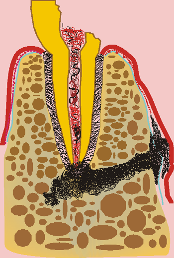Първоначална ситуация - схема на хроничен локализиран или дифузен периапикален периодонтит, който подлежи на апикална остеотомия. Около апекса на зъбния корен се формира кухина, изпълнена с разпаднати тъкани и клетки на хроничното възпаление. На схемата горе тази кухина е означена с черно - бяла текстура. В огромен процент от случаите оперативният достъп се осъществява от вестибуларна посока - при което понякога се изисква отнемането на много голям костен обем, особено при долни странични зъби.